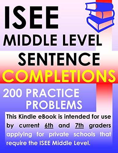 ISEE MIDDLE LEVEL SENTENCE COMPLETIONS - 200 PRACTICE PROBLEMS .Copyright June 2015 - ISEE Exam Preparation Experts .ISEE Middle Level Verbal SENTENCE COMPLETIONS practice only! ISEE Middle Level Verbal SENTENCE COMPLETIONS practice only! .*** Other ISEE Lower / Middle / Upper exam preparation materials from "ISEE Exam Preparation Experts" are available or will become available for your Amazon Kindle. .This Kindle eBook only contains ISEE Middle Level Verbal Sentence Completions problems. The actual ISEE Middle Level contains Verbal Synonyms, Quantitative Reasoning, Mathematics Achievement and Essay sections as well, but this eBook does NOT cover those sections. .This Kindle eBook is intended for use by current SIXTH and SEVENTH graders applying for private schools that require the ISEE Middle Level. .The ISEE has a Verbal Reasoning section that is composed of two different kinds of questions: Synonyms and Sentence Completions. This Kindle eBook only contains ISEE Middle Level SENTENCE COMPLETIONS practice problems. Both kinds of questions test your vocabulary and reasoning ability. Sentence Completion questions measure your ability to understand words and their function. Correct answers are based on clues that appear in the context of the sentence. In the Middle Level ISEE, the sentence completion answer choices are words that logically complete a sentence. STRATEGIES: - Read each sentence to get the overall meaning. - Focus on key words or clue words in the question to help you determine the correct answer. - Mentally fill in the blank with your own answer and then find the answer choice that is closest in meaning to your own answer. - Remember that there is almost always a word or phrase that obviously points to the correct answer. - Use word clues such as although, because, if, since, or therefore to help you figure out the relationships in the sentence. - After you choose your answer, go back and reread the whole sentence to be sure that it makes sense. .What is the purpose of these 200 ISEE Middle Level Verbal Sentence Completions practice problems? .A pervasive characteristic of ISEE Middle Level private school admission exams is that they are very difficult, oftentimes featuring test questions one to two grade levels above your child's current public or private school curriculum. The ISEE targets a small, highly competitive group of students applying for top private schools across the nation. .Using our years of experience developing training guides for a national test preparation company, we have created ISEE study materials that closely approximate the sequence, scope, phrasing and difficulty level of actual exams. We have accomplished this through years of meticulous research into individual ISEE test questions and through information acquired from former test participants. Thousands of applicants have worked through the ISEE Middle Level Verbal Sentence Completions practice problems contained within this Kindle eBook to enhance their candidacies in the private school admission process. .Parents should not overreact to "lower-than-expected" results. (Easy for us to say!) In addition to ISEE scores, most private schools take into account academic performance, teacher / counselor / coach recommendations, extracurricular activities and the personal interview / essay / portfolio in their admissions decision. But, of course, high ISEE scores help immensely. Remember that every child can improve his or her ISEE performance with the right mix of effort, instruction, materials, experience and encouragement!